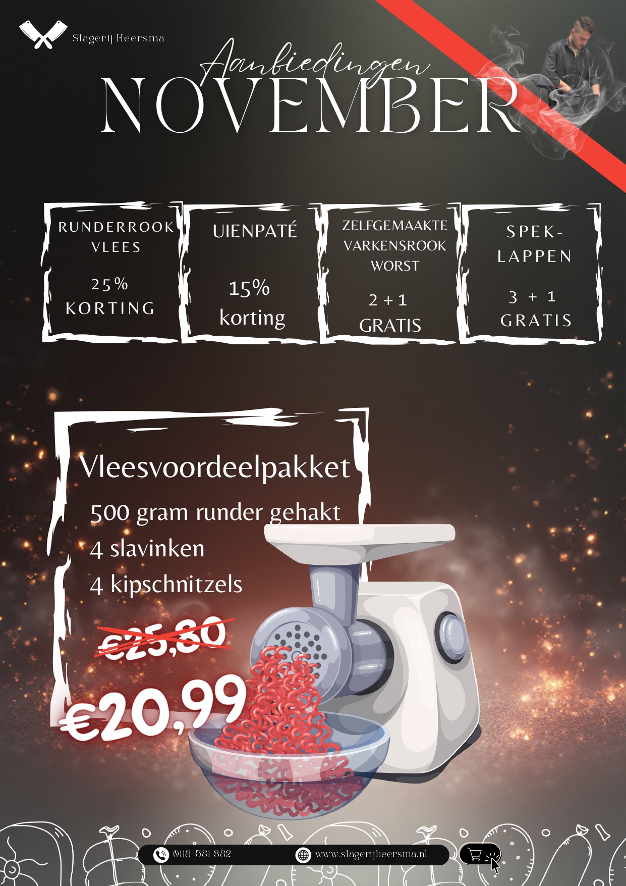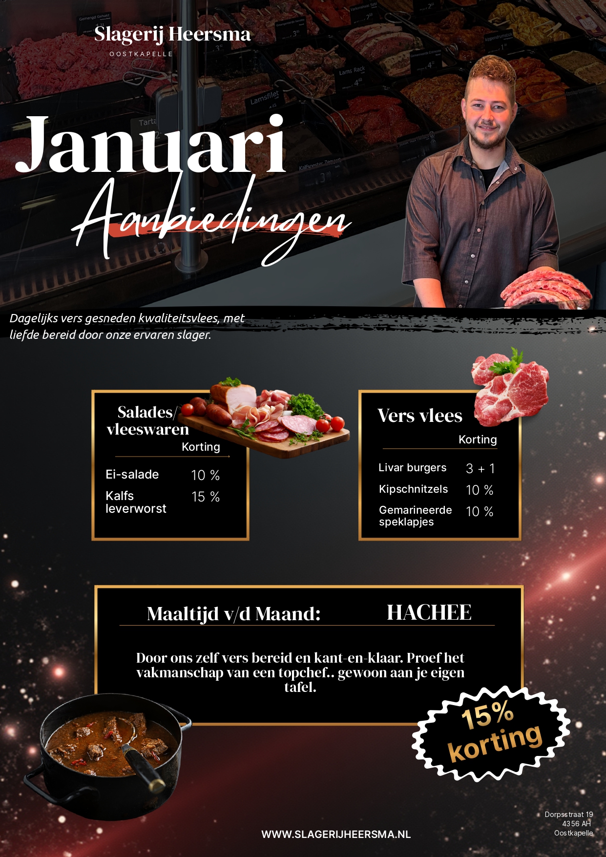 Wij zijn telefoonisch bereikbaar 0118-581382 en via email info@slagerijheersma.nl voor al je vragen.