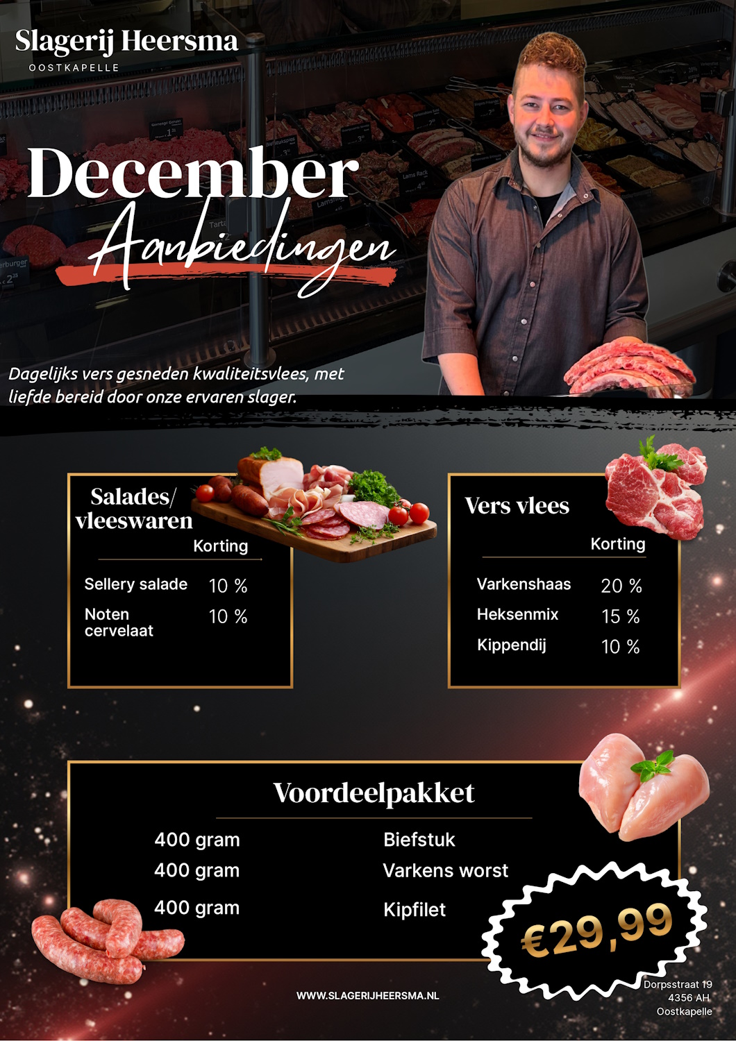 Wij zijn telefoonisch bereikbaar 0118-581382 en via email info@slagerijheersma.nl voor al je vragen.